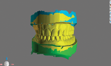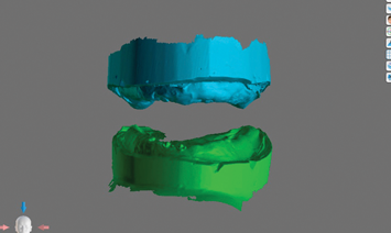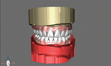 The existing overdenture restorations in the patient's current occlusal relationship and edentulous ridges were digitized (Figure 4). The landing area on the analog dental models was notched to aid in digital cross-mounting. This allows for the capture of edentulous ridge information in terms of relationship and vertical dimension and the transfer of this information to CAD software (Figure 5). In this case a software denture module was used to create a new digital set-up that can be printed for diagnostic purposes (Figure 6). The existing mini-implant attachments would be picked up chairside using radiopaque flexible reline material; this would allow for a dual-scan CBCT technique to enable the diagnostic set-up to be used in implant planning.1,2 The goal of the new set-up is to test different teeth arrangements, reduce gingival display, and check the amount of restorative space available to ensure an accurate restorative plan as this could affect implant position and distribution.