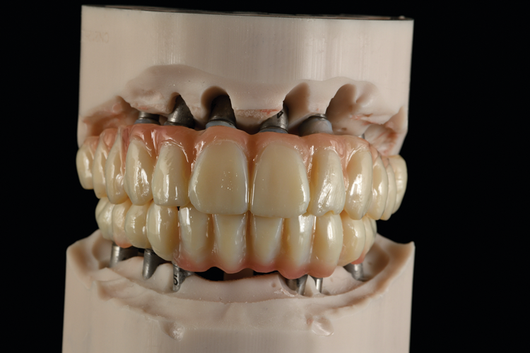 To finish the zirconia restorations, Ti bases were bonded with an adhesive resin cement into the zirconia framework on the master casts. Any bonding of abutments and/or Ti bases should be performed on a master cast, because these parts have a certain amount of spacing between the part and the restoration, which allows for a complete passive fit to be achieved by utilizing the master cast. The bonding protocol is crucial; the bonding areas of the zirconia and titanium are air-abraded by 1 to 2 bar aluminum oxide, and a primer is applied and air-dried for 60 seconds. After all areas are dry, the bonding material can be applied onto the Ti bases and the zirconia bridge can be moved over onto the model. Access holes have to be cleaned using a microbrush as does the access bonding material, and the restoration with the model is light-cured for 5 minutes. After curing, the restoration is unscrewed and taken off the master cast so the intaglio surface of the restoration may be cleaned.18 The cleaned and disinfected restorations were packed and shipped to the clinic for delivery to the patient.