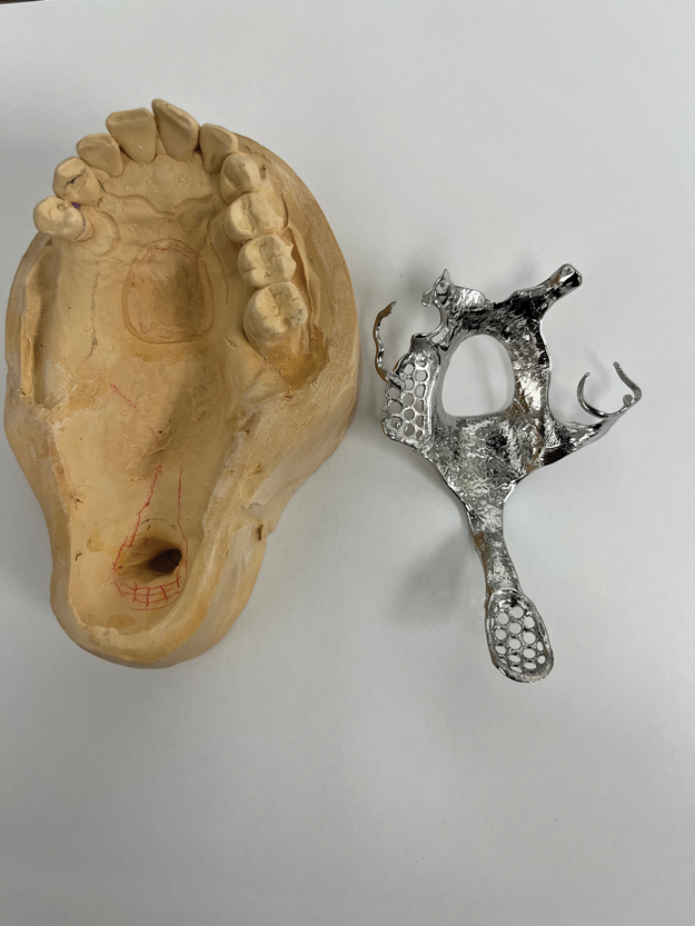 The case required a metal framework with an extension for a hollow bulb to cover the defect. The clinician had drawn an outline of the design with an indelible marker on the impression. The technician designed the frame with mesh retention so denture teeth could be processed to the frame. A sintered framework was fabricated (Figure 4 and Figure 5) and the denture teeth were set in wax for a try-in. Anatomical 33° denture teeth were utilized for better chewing capability (Figure 6). The clinician tried in the frame with the denture teeth and found everything to be acceptable, so the technician could proceed to the final prosthetic (Figure 7).